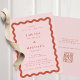 Faire-part de mariage moderne et design à l'ambiance rétro avec cadre de pétoncle ondulé en terre cuite avec arrière - plan rose vif, texte en terre cuite. Ajoutez un QR au verso pour diriger les invités vers votre site Web mariage.