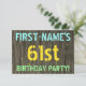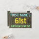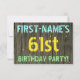 Les caractéristiques de conception ce d'amusement de fête d'anniversaire d'invitation un message aiment "la soixante-et-unième FÊTE D'ANNIVERSAIRE du PRÉNOM ! ", où le nom peut être personnalisé, sur l'avant. L'arrière - plan comporte un rustique, brun, le motif en bois d'aspect de grain de faux. Le texte du message personnalisable sur l'avant comporte des couleurs comme bleu, jaune, et vert, et il fait inspirer un aspect par cela du lettrage peint et marqué au poncif. Le dos comporte un message customisé qui pourrait inclure les détails appropriés au sujet de la fête d'anniversaire, telle que quand et où on le tient, avec n'importe quelle autre information qui est importante. Les invitations de fête d'anniversaire comme ceci pourraient être une manière d'amusement d'inviter la famille et les amis à une fête d'anniversaire étant tenue pour quelqu'un qui célèbre leur soixante premiers anniversaires. [~Z0000291]