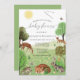 Baby shower de bois moderne et coloré, neutre pour le genre, dans une police élégante avec de mignons animaux et oiseaux de bois dans un pré avec des arbres.