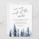 Élégante invitation à la fête de chaume en bois présente une copie de grands pins d'aquarelle dans les nuances brumeuses de bleu. "Notre nouveau cou des bois" apparaît en haut en écriture manuscrite. Personnalisez avec vos détails de célébration du réchauffement de la maison en dessous.