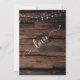 Voici une invitation saisissante pour votre événement après-réception de mariage. Le fond est d'abord recouvert d'une photo représentant du bois brut brun foncé avec des lignes horizontales. Le haut des deux côtés est drapé dans un graphique qui suggère des guirlandes de lumières brillantes scintillantes. Vos détails apparaissent en blanc. Pour compléter la police sans empattement utilisée pour votre texte modifiable, j'ai ajouté des mots clés et des accents "juste mariés", "et", ainsi que "amour" au dos, en utilisant une jolie police de calligraphie moderne.
