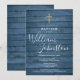 Une invitation de baptême ou de christening rustique avec une élégante croix dorée et le nom de signature en écriture sur un fond de panneaux de bois bleu. Personnalisez avec vos informations spéciales de baptême ou de christening dans une typographie chic. Conçu par Thisisnotme©