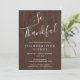 Une invitation à dîner d'action de grâce rustique avec l'expression "tellement reconnaissante" en blanc moderne lettré style script, sur une aquarelle arrière - plan en bois foncé. L'invitation peut être entièrement personnalisée avec les détails de votre événement. Le verso est composé d'un motif de feuilles d'aquarelle aux couleurs automnales.