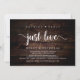 Belle Fête Rien de Fantaisiste Juste l'Amour, Carte d'annonce / invitation de mariage en fuite, dans un design moderne de bois brun rustique foncé. C'est parfait pour votre réception de mariage et votre fête de célébration post-mariage. Ajoutez vos détails dans la police / lettrage assorti.