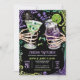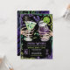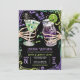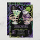 Cette invitation de cocktails et de costumes pour Halloween sur un thème de sorcière est idéale pour une fête d'Halloween effrayante. Ce design présente deux cocktails effrayants, un martini à l'œil avec une cuillère à tarentule et un cocktail de magie noire avec un crâne effrayant et une garniture de citron vert, tous deux tenus par des mains de squelette. Ils sont entourés d'une bordure magique de volutes, d'étoiles et de chauves-souris. Au verso de l'invitation se trouve un motif de volutes effrayant avec des crânes, des chauves-souris et des araignées. Vous pouvez personnaliser tout le texte de ce design. Voir la collection assortie complète.