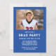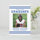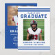 Celebrate your graduate’s achievement with this bold varsity-style blue graduation party invitation, featuring classic athletic stripes and strong collegiate typography for a timeless sports-inspired look. The front showcases the graduate’s photo alongside their name, school, and graduation year in a clean, structured layout that highlights their accomplishment with confidence and pride. The back features a horizontal photo at the top, with space below for graduation party details including the date, time, location, and RSVP information, creating a complete and personalized design. Perfect for high school and college seniors, student athletes, and sports enthusiasts, this blue photo graduation party invitation offers a polished and memorable way to invite guests to celebrate their milestone.