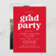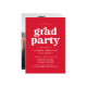 Invitations élégants de la fête de remise de diplômes avec "grad party" affiché en gras en lettres blanches avec le nom du diplômé et les détails de la fête indiqués ci-dessous sur un arrière - plan rouge. L'arrière de l'invitation rouge de la fête de remise des diplômes présente la photo verticale du diplômé. Les simples invitations de la fête de fin d'études sont parfaits pour les diplômés du secondaire et du collège.