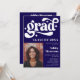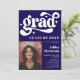 Célébrez le diplômé en style avec cette invitation à la fête de remise de diplômes d'inspiration rétro ! Avec une typographie "Grad" marine amusante et audacieuse avec des swashes ludiques et des étincelles, ce design apporte une touche vintage mais moderne. L'arrière - plan bleu vient compléter la photo d'études supérieures encadrée de façon élégante, créant une tenue de séjour exceptionnelle. Parfait pour les annonces et célébrations de fin d'études secondaires ou collégiales !