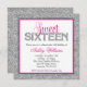 Une invitation moderne de fête d'anniversaire de sweet sixteen. En comportant des parties scintillantes d'argent de faux concevez avec des accents des roses indien et du noir. Les conceptions sont les graphiques imprimés par appartement - PARTIES SCINTILLANTES NON RÉELLES.