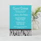 Il est facile personnaliser cette invitation du bonbon 16 à zèbre d'amusement pour votre fête d'anniversaire. Les caractéristiques de conception un motif noir et blanc d'impression de zèbre et un pois bleu turquoise. Employez les gisements en ligne de modèle pour changer le texte pour votre événement.