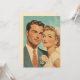 Une illustration romantique dans le style des années 50 d'un jeune couple marié, rayonnant d'amour et habillé de tenue de mariage classique. L'image capture un sentiment intemporel de joie et d'élégance, parfait pour la décoration à thème rétro, l'inspiration de mariage ou la publicité vintage.