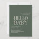 Invitation de baby shower moderne avec un agencement minimal avec "Hello Baby" en typographie audacieuse au milieu. Tous les éléments de conception sont en vert mousse et en ivoire et peuvent être changés dans l'outil d'édition de conception. Cette invitation baby shower simple mais élégante est neutre pour le genre, ce qui en fait un grand pour un baby shower garçon ou fille.