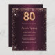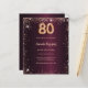 Pour un 80e anniversaire élégant. Une couleur de fond dégradé bordeaux. Décoré de fausse poussière scintillante dorée. Personnalisez et ajoutez un nom et les détails de la fête. Le nom est écrit avec un style de lettrage manuscrit.