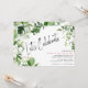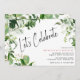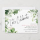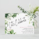 Invitations décontractées et mignonnes à la fête d'anniversaire avec un cadre de plantes tropicaux. Texte "Fêtons" dans une police de script avec les détails de votre événement dans le coin inférieur droit. Peut être changé à n'importe quel âge.