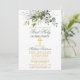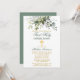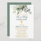 Moderne Elégant Première Sainte Communion Invitation inclut des feuilles d'eucalyptus aquarelle et d'autres beaux feuillage botanique verdoyant. Croix d'or. Sage Green Back.