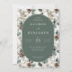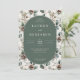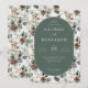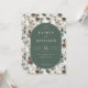 Cette élégante invitation de mariage présente un design d'inspiration vintage avec un panneau central en forme d'ovale sur un fond vert discret, entouré d'une bordure florale et botanique de feuilles, de baies et de pommes de pin dans des tons beige doux, vert olive et brun terreux. La disposition est symétrique, créant une composition équilibrée et harmonieuse qui dégage chaleur et sophistication. Une typographie serif élégante met en valeur les noms et les détails de l'événement, tandis que le style général mélange des impressions botaniques classiques avec un charme rustique, ce qui la rend parfaite pour une réunion intime et sophistiquée. La technique d'illustration numérique propre et soignée renforce la sensation naturelle et organique, idéale pour célébrer un moment de vie spécial avec grâce et raffinement.