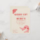 Cartes d'invitation d'anniversaire avec texte décoratif rose et rouge "Giddy Up", illustration de rose, et bottes de cowgirl roses avec des cœurs. Le fond est blanc cassé.