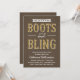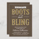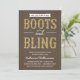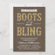 Cette invitation à la soirée bachelorette rustique chic et mignonne a un thème "Boots & Bling" avec typographie vintage, parties scintillant faux or, et un arrière - plan de texture bois.