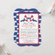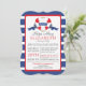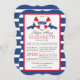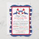 Baby shower nautique moderne rouge, blanc et bleu pour une douche neutre pour les hommes. Notre baby shower contemporain Ships Ahoy garçon ou fille invitation comprend un coeur rayé rouge & blanc Buoy avec une bannière bleue avec le mot bébé dessus. L'arrière - plan est une bande horizontale bleue et blanche, audacieuse et brillante. Retourne l'invitation pour une bande correspondante. Visitez notre boutique pour voir ceci pour un baby shower pour filles et un baby shower pour garçons.