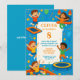 Venez fêter une fête palpitante avec ce design d'aventure gonflable, avec des enfants joyeux qui s'envolent sur une maison de rebond colorée, entourés de ballons lumineux et d'un décor bleu festif. Idéal pour une journée spéciale enfant, cette pièce personnalisable apporte une ambiance de haute énergie et ludique à la fête. Avec son style dynamique et ludique, il est idéal pour un rassemblement inoubliable. Inclut de l'espace pour les détails de votre événement et les informations RSVP. Personnalisez-le pour créer un délicieux souvenir pour votre petit et vos invités !