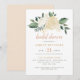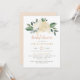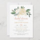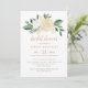 Une invitation de mariage moderne et épurée ancrée par un magnifique bouquet aquarelle centré de roses blanches, de fleurs dorées et de verdure luxuriante. La mise en page minimaliste laisse l'arrangement floral briller au-dessus des détails de l'événement, stylisé dans un mélange de calligraphie et de typographie sérif élégante avec des accents pêche et sauge. Tout le texte est entièrement personnalisable pour votre célébration.