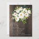 Nos magnifiques invitations de brunch de mariage floral sont remplies d'un élégant bouquet de fleurs blanches à l'aquarelle dans des tons chic de blanc et de vert sur un fond en bois sombre rustique imprimé.