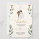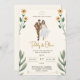 Invitation de bouquet de mariage tropical à ruban jaune Le thème du mariage comporte du texte dans un cadre dessiné à la main avec un dessin de bouquet sur un fond rayé jaune foncé.