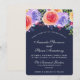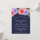 Une invitation de mariage avec un beau bouquet de roses aquarelles avec des brindilles, des feuilles et des branches tous ensemble dans un arrangement floral coloré le long du haut. Fond de couleur bleu marine.