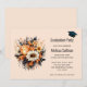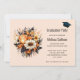 Invitation à la remise de diplômes avec un bouquet de fleurs élégant et gothique. Composé de tulipes orange, de marguerites jaunes, de feuilles et de brindilles grises et de quelques accents de baies orange.