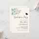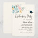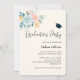 Invitation pour une fête de remise de diplôme avec une illustration aquarelle charmante. Un bouquet de fleurs avec des fleurs roses et bleues entourées de feuilles vertes et de brindilles. Une casquette de remise de diplôme au-dessus du texte.