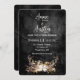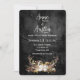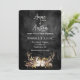 Chaîne de lumières scintillantes dans un bouquet floral de bois de cerf sur du cuir noir usé pour une invitation de mariage automnal.