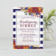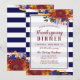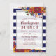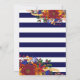 Invitation au dîner de Thanksgiving avec une composition florale d'automne comprenant des pensées orange, des roses bordeaux, des roses jaunes, du blé et des baies, sur des bandes bleu marine.