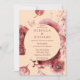 Un magnifique design faire-part de mariage, des fleurs bordeaux dessinées à la main d'une belle façon. L'arrière - plan est la pêche et le centre dispose d'un espace circulaire pour personnaliser vos informations. La police est de couleur bordeaux. Sur le dos se trouve un graphique floral bordeaux. Personnalisez votre faire-part de mariage aujourd'hui !