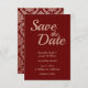 Un motif damassé rouge foncé ou bordeaux et or rose rouge pâle et rouge pâle pour votre mariage enregistrer les informations de date. Le texte Save the Date est un joli style calligraphique contemporain. L'arrière - plan derrière le motif de damas est une photo améliorée numériquement, et non une feuille métallique rose en or réel