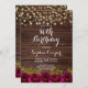 Rouge bordeaux rustique, roses marsala aquarelle, arrangement floral botanique design mariage avec feuilles verts et lumières à cordes sur bois de grange brun foncé. Dispose d'un élégant design de typographie manuscrite. Idéal pour une fête d'anniversaire adulte pour elle : 13ème 15ème 16ème 18ème 20ème 21ème 30ème 40ème 50ème 60ème 70ème 80ème 90ème 100ème, ou tout âge. Veuillez noter que ce design est un effet photo imprimé sans bois. #3348