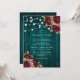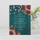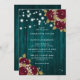 Invitations de mariage turquoises et bordeaux personnalisées, avec roses et bébés respirant sur un arrière - plan en bois de grange orné de lampes à cordes. Un design de carte idéal pour inviter vos invités à votre mariage rustique bordeaux et turquoise. Objets de correspondance disponibles pour compléter ces invitations turquoises et bordeaux rustiques à des mariages floraux.