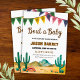 Fêtons un bébé en route ! Invitation vos amis et votre famille à célébrer avec cette invitation de baby shower amusante et festive sur le thème du Sud-Ouest. Le design présente un charmant paysage de désert d'aquarelles avec des cactus, surmonté d'une bannière colorée. Le titre ludique "Bout a Baby" et les polices rustiques créent une atmosphère chaleureuse et festive parfaite pour honorer les parents à venir. Tous les détails de la fête sont entièrement personnalisables pour votre événement spécial.