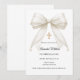 A white background, decorated with a large ivory colored bow with pearls and a golden cross. Personalize and add a name and details details.