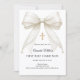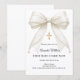 Celebrate your daughter's milestone with this elegant First Holy Communion invitation. This design features a stunning, oversized ivory silk bow adorned with delicate pearl strands and a central ornate gold cross. It is the perfect choice for a traditional Catholic ceremony or a sophisticated religious celebration for a young girl.