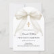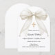 An arch shaped First Communion invitation. White background, decorated with a large ivory colored bow with pearls and a golden cross. Personalize and add a name and details details.