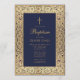 Cette élégante invitation au baptême floral (baptême) à l'air vintage a un cadre doré fleuri de décorations roses sauvages complexes sur un arrière - plan bleu marine. Tout le texte peut être personnalisé et a une couleur dorée semblable aux roses dorés sur le cadre. Au-dessus du texte, il y a une croix d'or. Le mot "baptême" est écrit dans un élégant script calligraphique. Sur le dos, il a une croix d'or sur arrière - plan bleu marine. Le cadre rose d'or est tiré d'une couverture vintage de 1912, de The Complete Poetical Works of Geoffrey Chaucer, maintenant dans le domaine public.