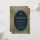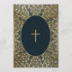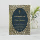 Cette élégante invitation de confirmation avec un air vintage a un cadre doré vintage avec des décorations feuilles en spirale sur un arrière - plan bleu marine foncé. Le texte est à l'intérieur d'un ovale avec une bordure dorée et a une croix d'or au-dessus. Le nom du garçon est écrit dans un élégant script calligraphique. Tout le texte peut être personnalisé et a une couleur dorée semblable aux décorations dorées du cadre. A l'arrière, on retrouve les mêmes décorations feuilles dorées et un ovale plus petit avec une croix dorée au centre. L'arrière - plan avec ses élégantes décorations feuilles en or sur bleu marine est d'une couverture de livre vintage, par T. J. Cobden-Sanderson (1840-1922), pour The Capital par Karl Marx; publié en 1884, maintenant dans le domaine public. Le livre appartenait à l'artiste William Morris.