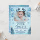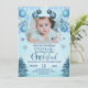 Une invitation à l'anniversaire d'un an au pays des merveilles d'hiver avec des ornements d'hiver de couleur bleue et des arbres gelés et des flocons de neige et du côté glacé bleu. Parfait pour l'invitation d'anniversaire de 1er bébé garçon.