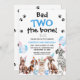 Boys Blue Bad Two The Bone Dogs 2nd Birthday Invitation chien mignon thème 2e anniversaire invitation avec divers chiens, ballons, casquettes de fête et d'illustration osseuse. Cette mauvaise invitation à l'anniversaire d'os a aussi des empreintes de pattes noirs.
