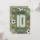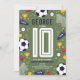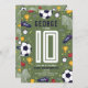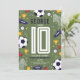 This cute and modern soccer-themed kids’ birthday invitation features a vibrant green background with playful illustrations of a football (soccer ball), trophies, stars, goals, and soccer boots. The back includes a matching sporty pattern for a fun, coordinated look. Easily personalize the invite with your child’s name, age, and all the important party details. Perfect for any young football fan’s celebration! This sample is shown as a 10th birthday invitation, but you can quickly change this under “Personalize this template” if needed.
