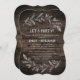 Cette carte d'invitation en bois à branches courbes pour une fête est parfaite pour un événement moderne. Le design chic campagne présente la silhouette de deux branches florales disposées pour composer une couronne rustique de feuilles sur un fond en bois.
