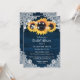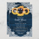 Beautiful navy blue rustic sunflower bridal shower featuring sunflowers on a barn wood background adorned with white floral lace and string lights. Matching items available