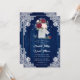 Faire-part de mariage rustique bleu marine, bordeaux et roux avec bouquet de respiration pour bébé, roses bordeaux et roses rousses à l’intérieur d’un bocal de maçon contre un arrière - plan en bois de grange bleu orné de dentelle fleurie blanche et de lumières scintillantes. Un design de carte parfait pour inviter vos invités à votre mariage bleu marine, bordeaux et rustique.
