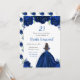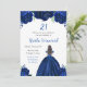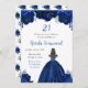 Cette invitation à la fête d'anniversaire présente des fleurs bleu marine de parties scintillant faux et une belle princesse aux cheveux bruns et une robe élégante. C'est parfait pour une fête d'anniversaire.