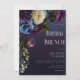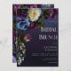 Cette invitation de brunch pour une douche de mariage présente un design avec un fond bleu marine foncé et mélancolique avec une belle gerbe florale latérale de violet, bordeaux, blanc et bleu pervenche avec feuillage vert foncé et baies violettes foncées. Créé par Simply Farmhouse Press.